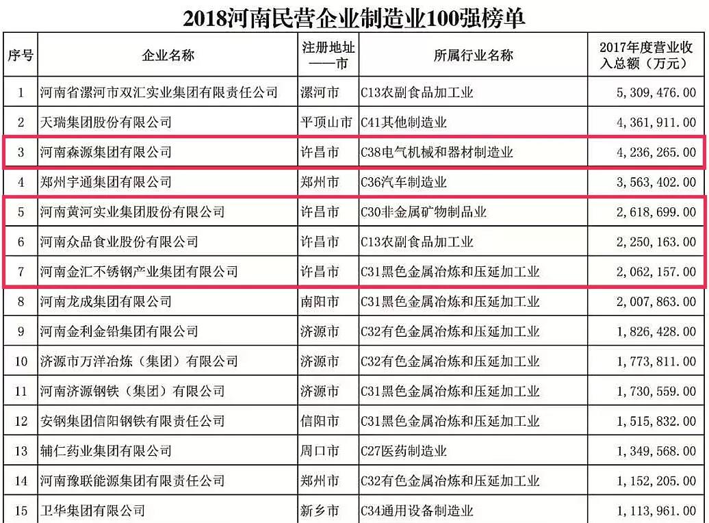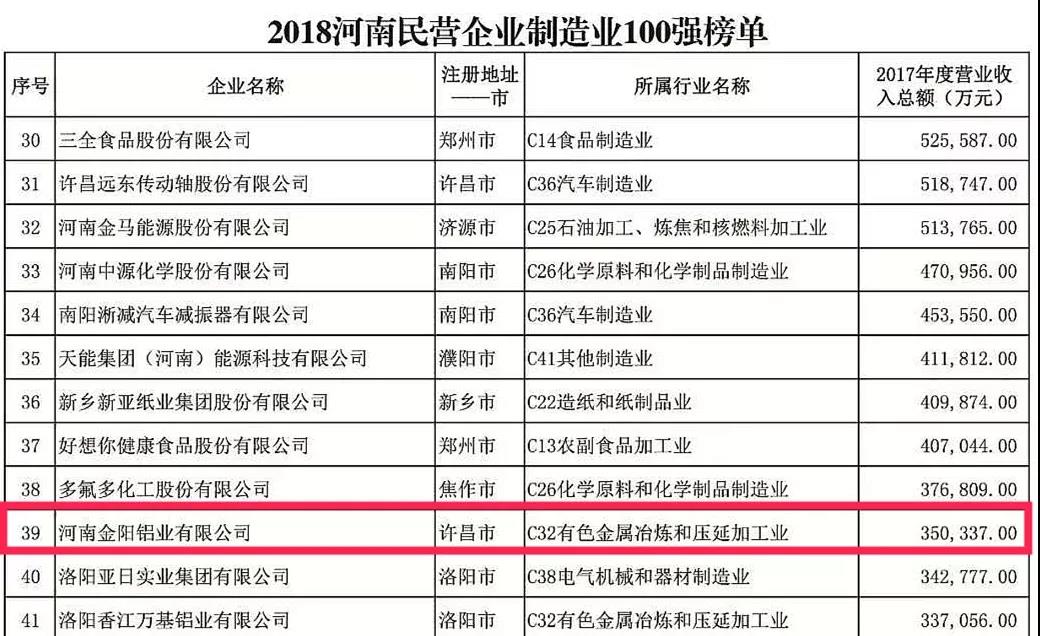 2018“河南民营企业制造业100强”榜单中,AYX(中国)一站式服务平台集团、黄河集团、众品食业、金汇集团和金阳铝业分别排在第3名、第5名、第6名、第7名及第39名。