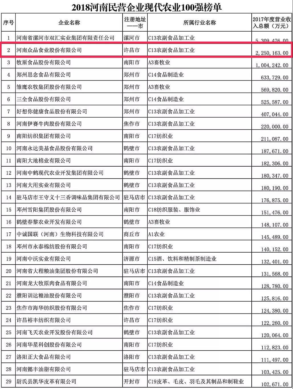 2018“河南民营企业现代农业100强”榜单中,众品食业排在第2位。