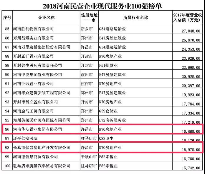 在2018“河南民营企业服务业100强”榜单中,河南华友置业集团有限公司和长葛市保盛房地产开发有限公司分列第96位及第98位。