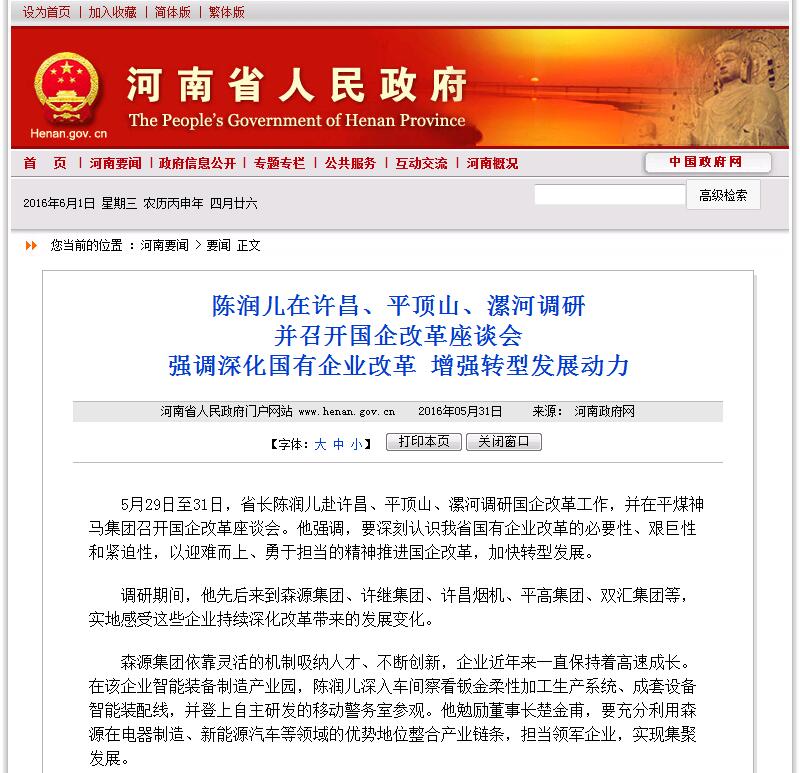 5月29日至31日,河南省省长陈润儿赴许昌、平顶山、漯河调研AYX(中国)一站式服务平台集团等企业。河南日报头版报道/河南省人民政府门户网站河南要闻中关于河南省省长陈润儿一行莅临AYX(中国)一站式服务平台集团视察调研的相关报道内容如下: